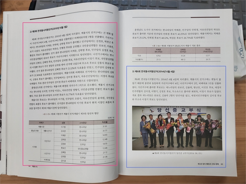 [사진2] 책 왼쪽은 제5회 전국동시지방선거 결과 내용에 당선자(이기원) 사진이 없다. 오른쪽은 제6회 전국동시지방선거 결과 내용에 당선자(최홍묵) 사진을 실려 있다.(계룡시지 제3권 64쪽)