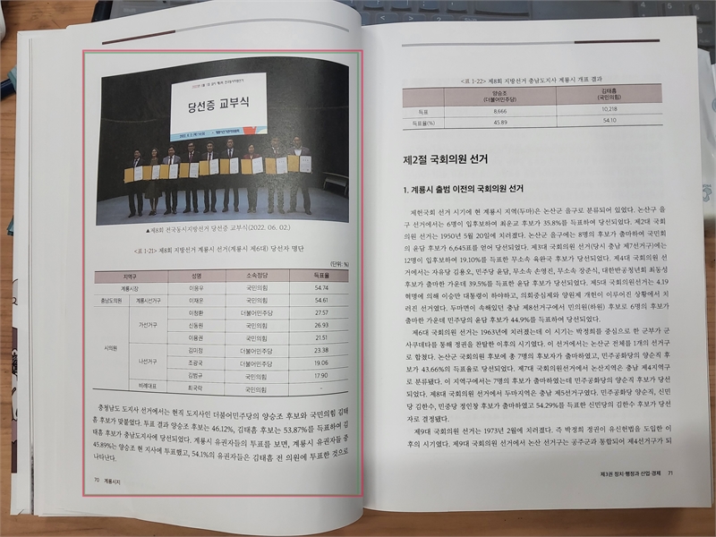 2023년 10월 발간 배포한 계룡시지 제3권에는 역대 대통령선거, 국회의원선거, 지방선거의 결과가 정리되어 있다. 특히 지방선거 부분(58쪽~84쪽)을 보면, 역대 당선자들의 사진과 당선증 교부 장면, 당선자 간담회 모습 등이 빠짐없이 수록되어 있다. 그러나 유독 제5회 전국동시지방선거(2010년 6월 2일)만은 선거결과 내용에서 당선자 사진이 실리지 않았다(사진2).
