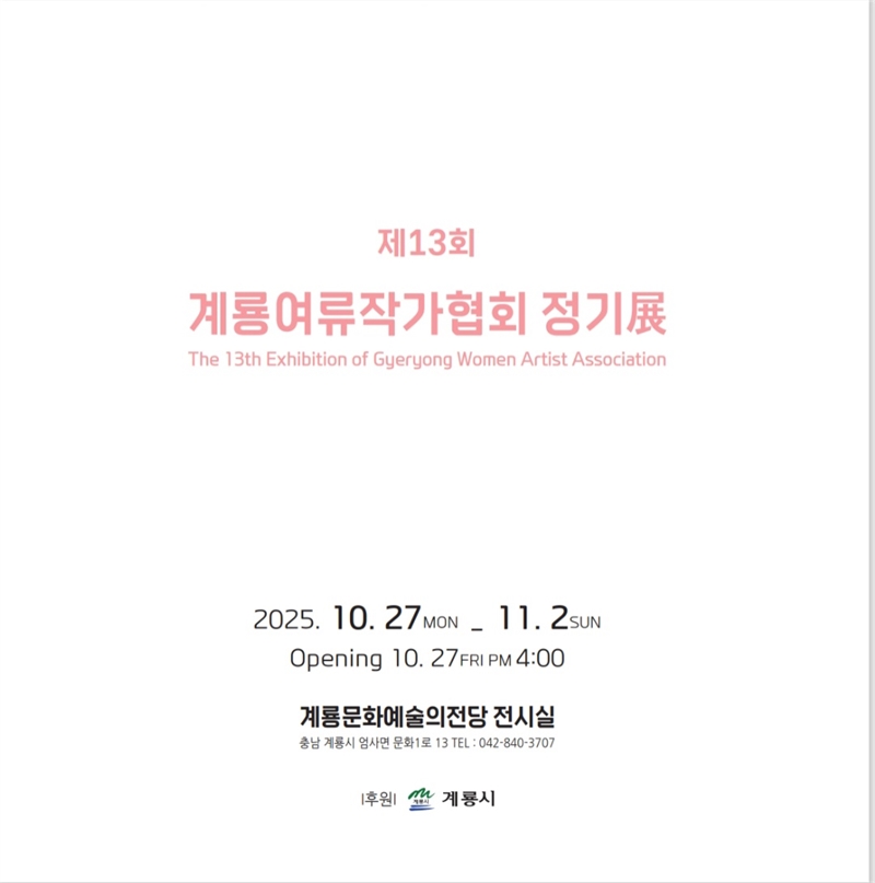 교육/문화 > 문화예술 제13회 계룡여류작가 회원정기전 이재수 승인 2025.11.01 05:08 0 제13회 계룡여류작가협회 회원정기전이 계룡문화예술인전당 전시실에서 지난 27일 개막해 11월 2일까지 열린다. 제113회 계룡여류작가협회 정기전 포스터 0 0 계룡신문 이재수 artmine@hanmail.net 이재수의 기사 더보기 저작권자 ⓒ 계룡신문, 무단 전재 및 재배포 금지