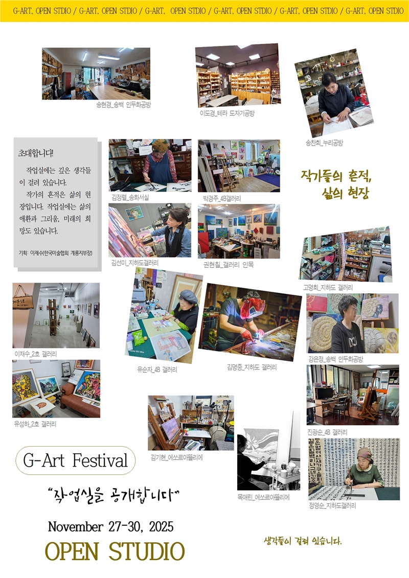 한국미술협회 계룡지부(지부장 이재수)는 계룡시 엄사면과 금암동에 위치한 작가 창작실 10여 곳에서 11월 27일부터 30일까지 나흘간 ‘G- Art, Open studio_작업실을 공개합니다’를 개최한다.